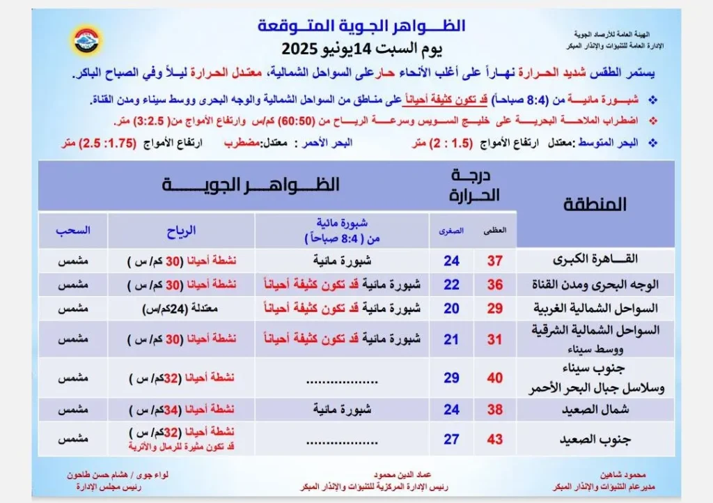 أعلنت هيئة الأرصاد الجوية توقعات حالة الطقس المتوقعة وحالة الظواهر الجوية ليوم غدٍ السبت 14 يونيو مشفوعة بدرجات الحرارة على بعض مدن الجمهورية.